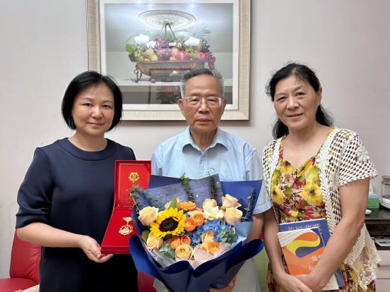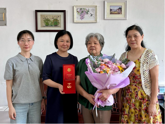 张东蕙书记、郑茨萍老师、杨紫惠老师走访慰问翁贤芝老师,并颁发纪念章