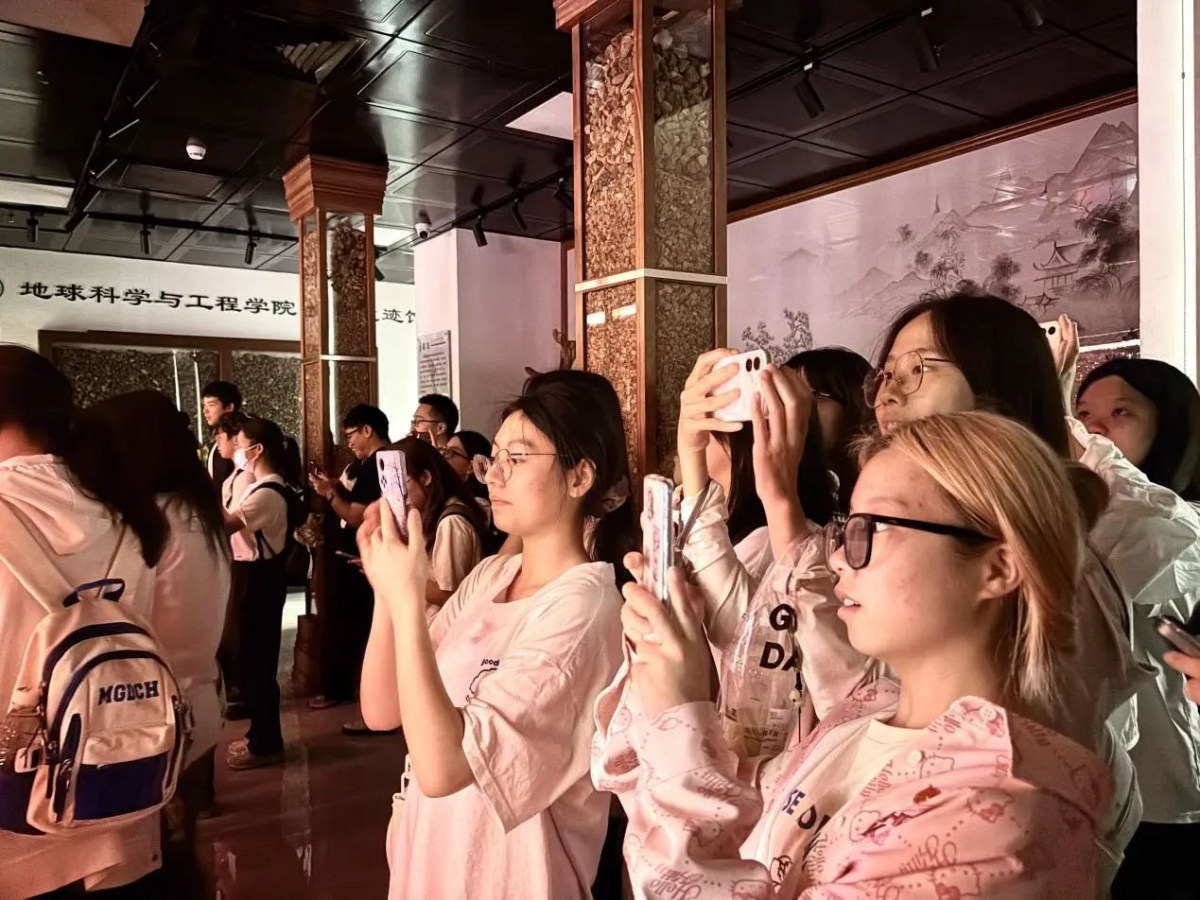 在地球科学与工程学院地质矿物博物馆,千余件矿物标本生动呈现了地球演化的壮丽图景。我校科普志愿者同学带领师生详细了解了“石头中的科学密码”。斑斓的水晶、罕见的化石引得师生驻足研讨,每一块岩石都诉说着地球亿万年演化的故事、每一份标本都展示着历史沉淀下的地理奥秘。在参观中,学员们也在自然科学规律中学习以科学的思维方式看待世界、解决问题。