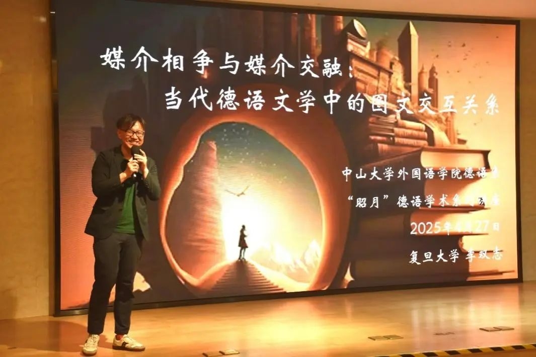 2025年4月27日晚,“昭月”德语学术系列讲座第二期在学院101讲学厅举行,复旦大学德文系主任李双志教授受邀作“媒介相争与媒介交融:当代德语文学中的图文交互关系”主题讲座。本次讲座吸引了德语系、哲学系、中文系等院系近百名同学和老师参加,现场学术氛围浓厚。讲座由德语系主任杨劲教授主持。