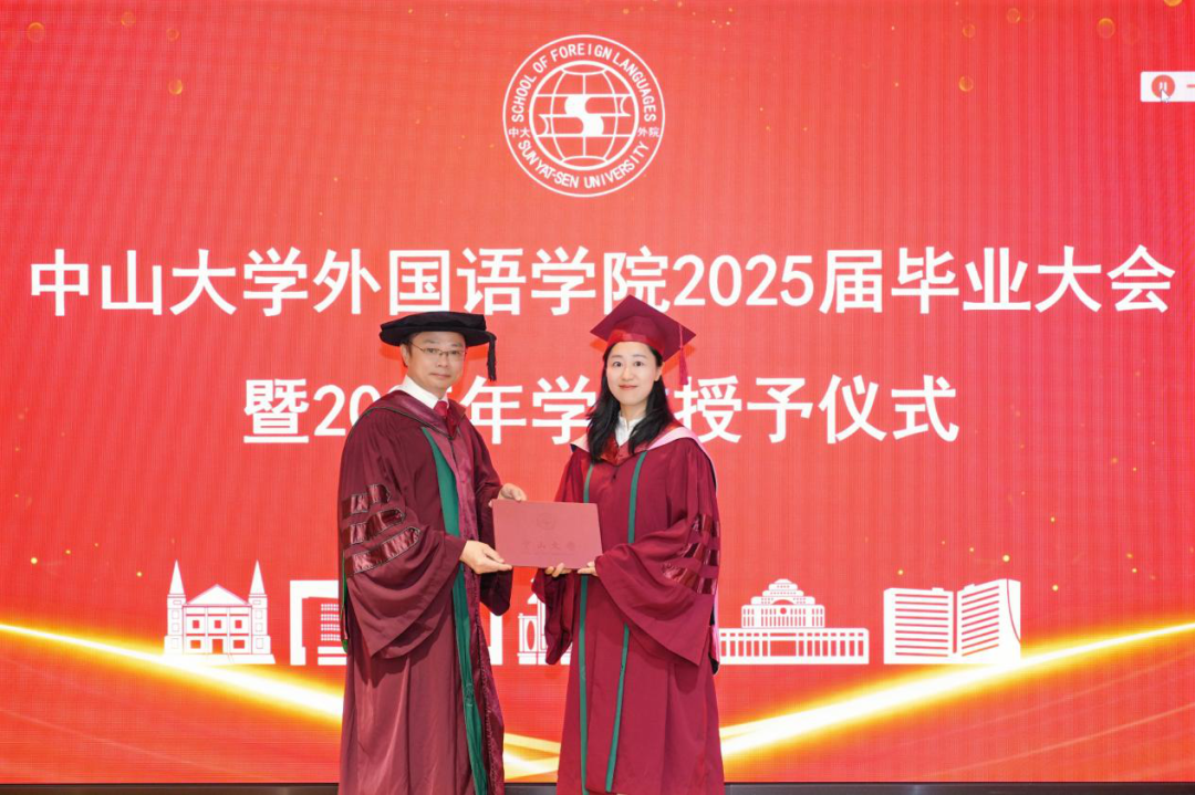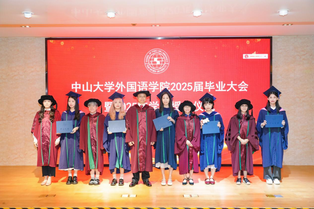 王勇院长致辞,代表学院向全体2025届毕业生表示由衷的祝贺,并对悉心教导的老师们、默默付出的教职员工,以及一直关爱支持同学们的家人们,表达最崇高的敬意与最衷心的感谢!他深情指出,同学们怀揣梦想踏入康乐园,迈进外院,并在这里度过了人生中最美好的时光。尝遍了挑战与磨砺,收获了知识、能力、智慧和友谊。大家共同经历了疫情时期的艰难,也幸运地见证了“世纪中大 百年外语”的盛况;经历了从“外语是工具”到“外语是专业”的认知蜕变,也在通识与专业的融合中跃升;曾有过“AI时代外语何为?”的困惑,也在外国语言、文学、文化的滋养中欢欣、愉悦、启迪,在一次次的阅读、思考和写作中养成了沟通世界、讲述中国的才干与担当。在毕业的路口,在启航新征程之际,他向毕业生们送出三句嘱托:做一个有温度的思想者;做一个会沟通的连接者;做一个善掌舵的领航者,将分别的感伤与不舍化作动力,助每一位临行的学子勇毅前行。外院的大门永远为远行的校友敞开,外院将以家的温暖一直关注、支持校友的成长,希望成为校友的大家要持续关心关注学院学校的发展。