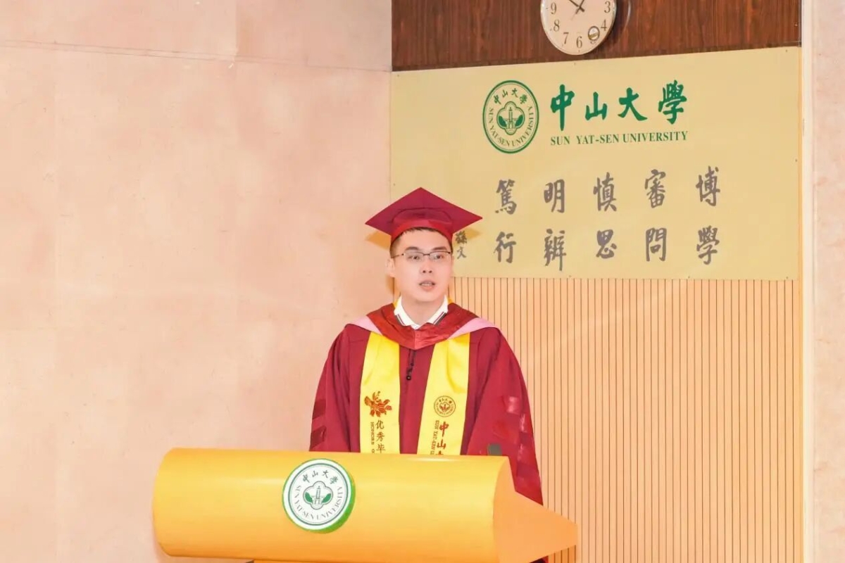 2021级外国语言文学专业博士研究生毕业生代表高楠发言。他以乔布斯的“连接点”“爱与失去”“生命轮回”三个故事为脉络,分享读博四年的成长感悟。他谈到,初入学术门径时曾在文献研读、组会汇报中屡屡碰壁,但正是这些看似零散的努力最终构筑了知识根基,印证了“当下积累终将串联成未来方向”的真理;面对科研路上的拒稿与失败,支撑他走下去的是“跌倒后仍选择站起”的信念,呼吁师弟师妹善待逆境中坚持的自己;在时代焦虑与现实压力下,他以“生命有限”警示勿困于外界评价,应倾听内心声音,忠于本心选择。最后,他寄语毕业生们相信努力的意义,在低谷中坚守自我,以清醒笃定的姿态奔赴未来,让康乐园的奋斗岁月成为照亮人生的星光。