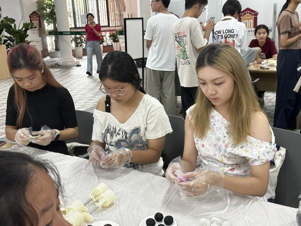 活动伊始,学院准备的丰富物料就已整齐摆放:雪白的饼皮,精心挑选的各式馅料与精美的模具一应俱全。在学生志愿者的耐心指导下,师生们纷纷戴上一次性手套,学习制作冰皮月饼。从饼皮的擀制、馅料的包裹,到模具的压花成型,大家都兴致勃勃、专心致志地投入月饼制作活动。其中,不少同学是第一次亲手做月饼,虽手法略显生涩,却满怀热情,将祝福与心意一点点揉进香甜的馅料中。小小的月饼,在此刻不仅是应节的美食,更是连接情谊、传递温暖的纽带,让团圆的寓意在动手实践中变得真实可感。这是对传统节日的致敬,也是一次极具意义的劳动教育。