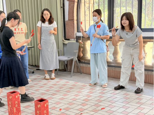 投壶区欢声笑语不断,师生们手持木矢,瞄准壶口,一试身手。现场气氛热烈而欢快,木矢落入壶中的清脆声响,与阵阵笑语掌声交织在一起,汇成了一曲中秋欢歌。
