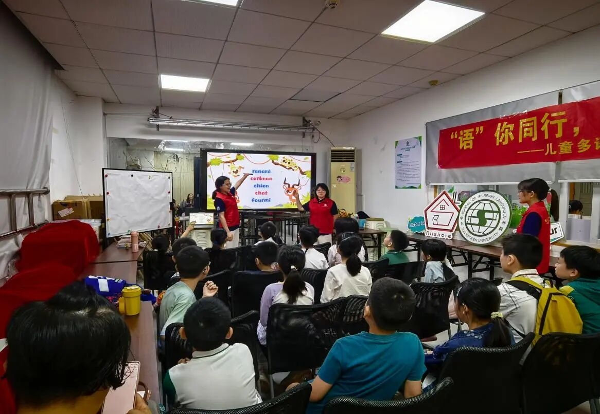 法语课堂上,志愿者借助法国著名儿童文学家拉·封丹的动物寓言故事,带领孩子们认识了狐狸、乌鸦、猫、狗、蚂蚁等基础词汇,标准的发音与细致的讲解让陌生的法语变得亲切易懂;剪影猜动物游戏的开展,更是点燃了孩子们的参与热情,大家踊跃抢答、积极互动,在欢声笑语中巩固知识,收获满满的学习成就感。