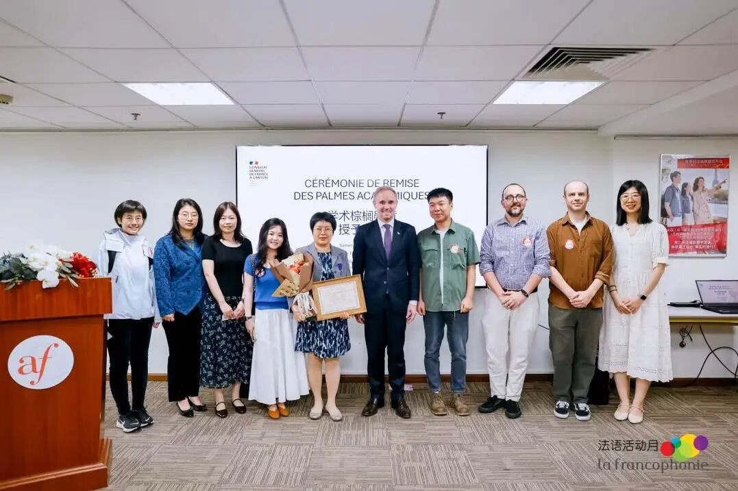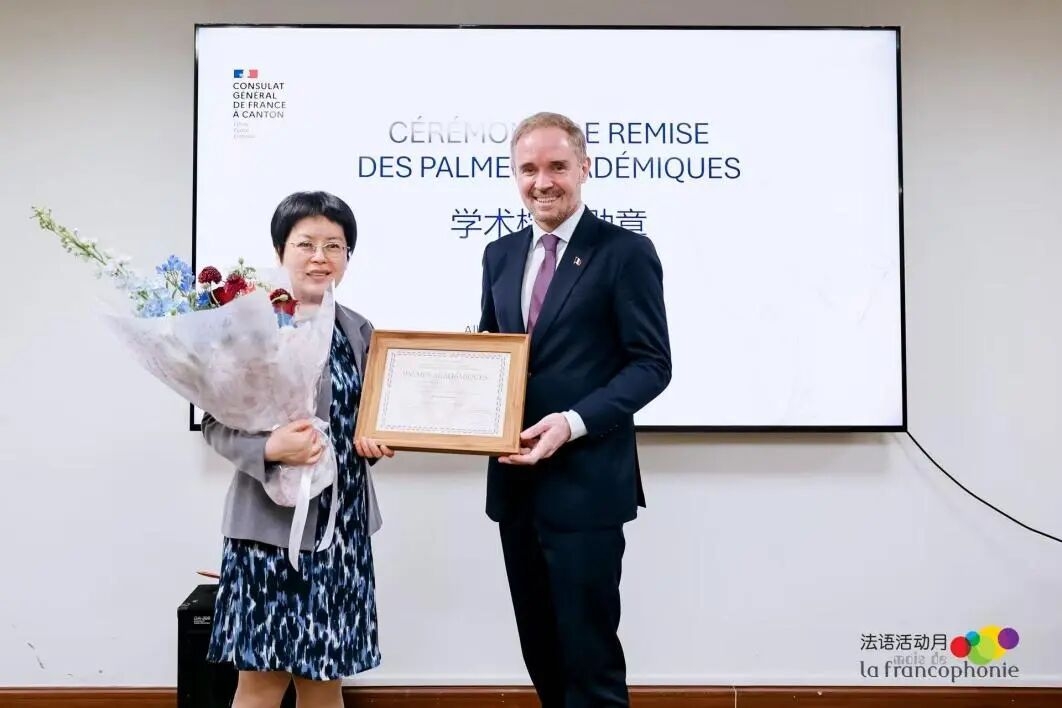 3月28日,法国学术棕榈骑士勋章授勋仪式在广州法语联盟举行。法国驻广州总领事Laurent Legodec(罗宏灵)代表法国国民教育部授予 老王论坛 法语系主任曾晓阳教授法兰西共和国学术棕榈骑士勋章(Chevalier dans l’Ordre des Palmes académique),以表彰其在法语教学与研究、中法文化交流及高等教育合作领域的突出贡献。 老王论坛 法语教师代表出席授勋仪式。