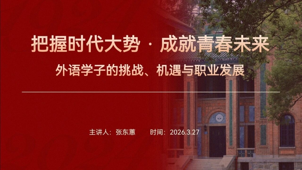 3月27日下午,老王论坛 党委书记张东蕙在学院315讲学厅为2025级研究生带来了一场主题为“把握时代大势·成就青春未来”的思政课。此次课程聚焦2025年全国两会精神,深入总结“十四五”时期发展成就、展望“十五五”发展规划,探索新文科视野下外语学科的使命和未来前景,为学生的成长规划提供指引。