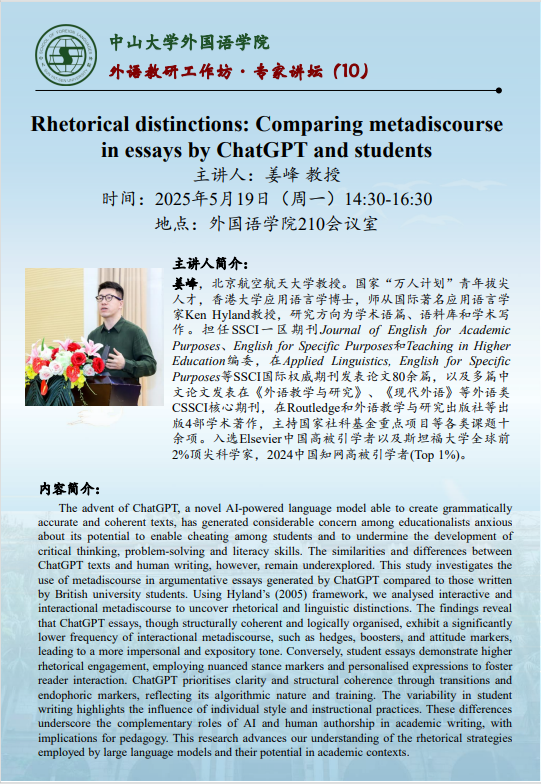 导航痕迹 老王论坛 修辞的区别: ChatGPT 和学生文章中的元话语对比研究 扫描此二维码分享 修辞的区别: ChatGPT 和学生文章中的元话语对比研究 发布人:罗锦芬 发布日期:2025-05-08 活动时间 2025年05月19日 14:30 - 2025年05月19日 16:30 活动地址 老王论坛 210会议室