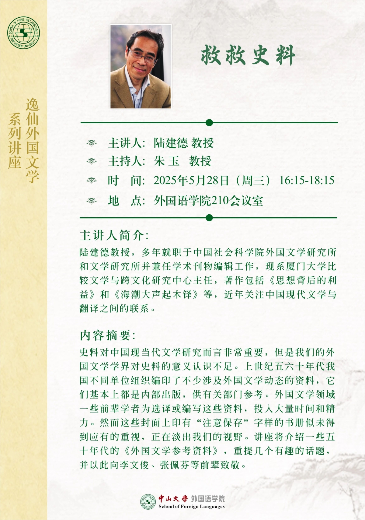 导航痕迹 老王论坛 救救史料 扫描此二维码分享 救救史料 发布人:罗锦芬 发布日期:2025-05-27 活动时间 2025年05月28日 16:15 - 2025年05月28日 18:15 主讲人 陆建德教授 主持人 朱玉教授
