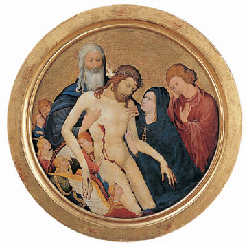 Grande Pietà ronde, attribuée à Jean Malouel, peinture sur bois. Commandée par Philippe le Hardi, duc de Bourgogne (mort en 1404). Vers 1400.