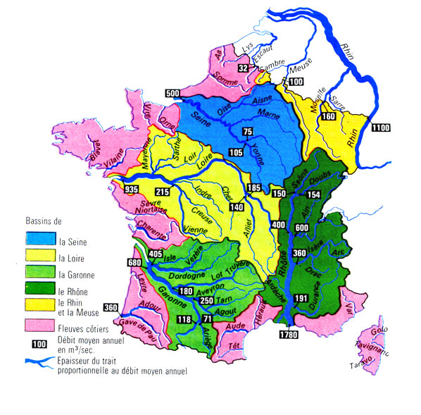 L’Atlantique reçoit les eaux des réseaux hydrographiques de la Loire et de la Garonne, ainsi que de nombreux fleuves côtiers (Aulne, Blavet, Vilaine, Sèvre Niortaise, Charente, Adour). La Manche reçoit les eaux des bassins de la Somme et de la Seine, ainsi que celles des fleuves côtiers de Normandie (Orne) et de Bretagne septentrionale (Rance). Les cours d’eau tributaires de la Méditerranée sont représentés par le réseau hydrographique du Rhône moyen et inférieur et de son principal affluent, la Saône, ainsi que quelques fleuves côtiers (Var, Hérault, Aude). Le Rhin et son affluent la Moselle, la Meuse et son affluent la Sambre, et l’Escaut, s’écoulent vers la mer du Nord.