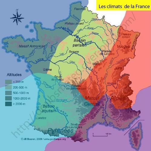 - le quart nord-ouest du pays appartient au domaine breton, avec ses nuances parisiennes et flamandes ; celui-ci est caractérisé par des températures douces, une amplitude thermique faible et des précipitations relativement importantes ;